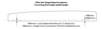 To achieve a correction of the octave for individual strings, the point of contact between that string and the saddle must be moved. If your tuner shows a positive deviation (+ Cent) in the frequency, the point of contact must be moved away from the sound hole. In the case of a negative deviation (- Cent), the point of contact needs to be moved closer to the sound hole.