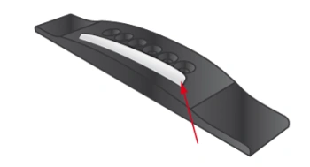 This can be corrected by means of fine (320-400) sandpaper. For this purpose, release the strings from the bridge and then remove the saddle, pinching it between index finger and thumb. Holding the saddle in one hand, with the other hand gently sand the curved surface until the grooves disappear. To provide a smooth finish, the affected area can be polished with tooth paste (the brand is up to you!).