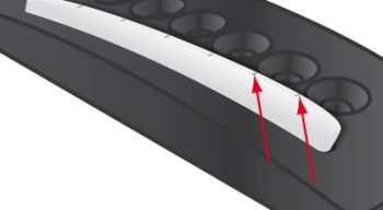 The strings are guided over the saddle, equidistant from each other and it is normal for slight grooves to form at the points of contact, over time.